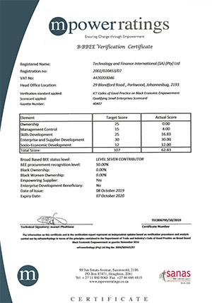 BBBEE Status: TFI is a Level 7 Contributor with a 50% Procurement Recognition Level.